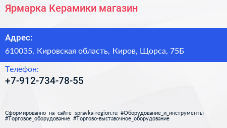 Ярмарка Керамики, магазин по адресу 610035, Кировская область, Киров, Щорса, 75Б в дальнейшем Организация, размещена в следующих категориях: