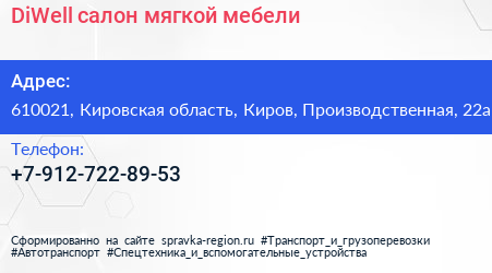 DiWell`, салон мягкой мебели по адресу 610021, Кировская область, Киров, Производственная, 22а в дальнейшем Организация, размещена в следующих категориях: