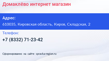Домаклёво, интернет-магазин по адресу 610035, Кировская область, Киров, Складская, 2 в дальнейшем Организация, размещена в следующих категориях: