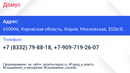 Домус по адресу 610046, Кировская область, Киров, Московская, 102в/Б в дальнейшем Организация, размещена в следующих категориях: