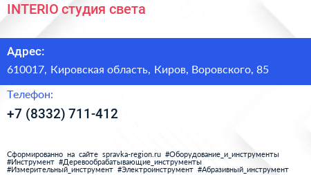 INTERIO, студия света по адресу 610017, Кировская область, Киров, Воровского, 85 в дальнейшем Организация, размещена в следующих категориях: