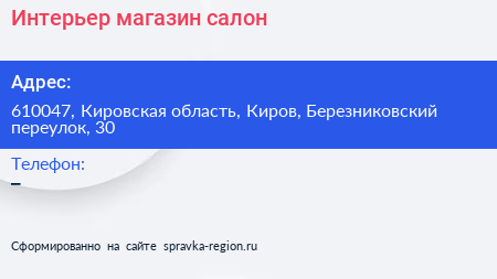 Интерьер, магазин-салон по адресу 610047, Кировская область, Киров, Березниковский переулок, 30 в дальнейшем Организация, размещена в следующих категориях: