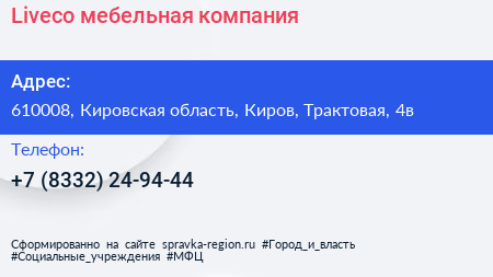 Liveco, мебельная компания по адресу 610008, Кировская область, Киров, Трактовая, 4в в дальнейшем Организация, размещена в следующих категориях: