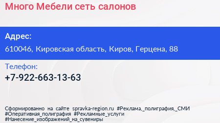Много Мебели, сеть салонов по адресу 610046, Кировская область, Киров, Герцена, 88 в дальнейшем Организация, размещена в следующих категориях:
