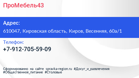 ПроМебель43 по адресу 610047, Кировская область, Киров, Весенняя, 60а/1 в дальнейшем Организация, размещена в следующих категориях: