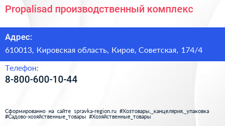 Propalisad, производственный комплекс по адресу 610013, Кировская область, Киров, Советская, 174/4 в дальнейшем Организация, размещена в следующих категориях: