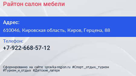 Райтон, салон мебели по адресу 610046, Кировская область, Киров, Герцена, 88 в дальнейшем Организация, размещена в следующих категориях: