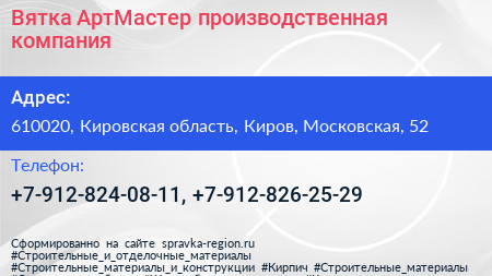 Вятка-АртМастер, производственная компания по адресу 610020, Кировская область, Киров, Московская, 52 в дальнейшем Организация, размещена в следующих категориях: