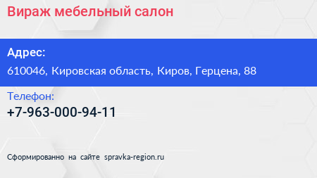 Вираж, мебельный салон по адресу 610046, Кировская область, Киров, Герцена, 88 в дальнейшем Организация, размещена в следующих категориях: