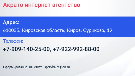 Акрато, интернет-агентство по адресу 610035, Кировская область, Киров, Сурикова, 19 в дальнейшем Организация, размещена в следующих категориях: