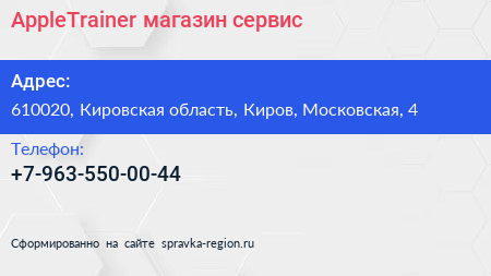 AppleTrainer, магазин-сервис по адресу 610020, Кировская область, Киров, Московская, 4 в дальнейшем Организация, размещена в следующих категориях: