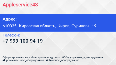 Appleservice43 по адресу 610035, Кировская область, Киров, Сурикова, 19 в дальнейшем Организация, размещена в следующих категориях: