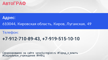 АвтоГРАФ по адресу 610044, Кировская область, Киров, Луганская, 49 в дальнейшем Организация, размещена в следующих категориях: