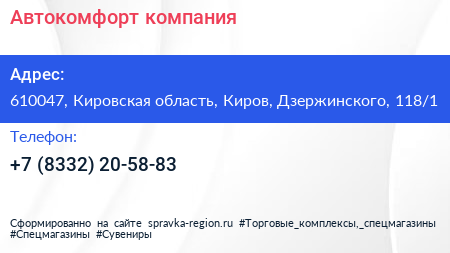 Автокомфорт, компания по адресу 610047, Кировская область, Киров, Дзержинского, 118/1 в дальнейшем Организация, размещена в следующих категориях: