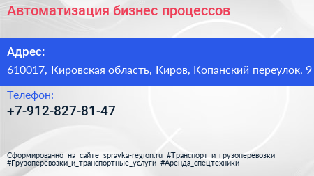 Автоматизация бизнес-процессов по адресу 610017, Кировская область, Киров, Копанский переулок, 9 в дальнейшем Организация, размещена в следующих категориях: