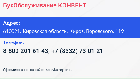 БухОбслуживание КОНВЕНТ по адресу 610021, Кировская область, Киров, Воровского, 119 в дальнейшем Организация, размещена в следующих категориях: