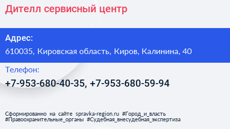 Дителл, сервисный центр по адресу 610035, Кировская область, Киров, Калинина, 40 в дальнейшем Организация, размещена в следующих категориях: