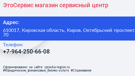 ЭтоСервис, магазин-сервисный центр по адресу 610017, Кировская область, Киров, Октябрьский проспект, 70 в дальнейшем Организация, размещена в следующих категориях: