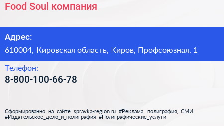 Food Soul, компания по адресу 610004, Кировская область, Киров, Профсоюзная, 1 в дальнейшем Организация, размещена в следующих категориях: