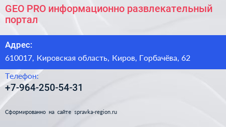 GEO.PRO, информационно-развлекательный портал по адресу 610017, Кировская область, Киров, Горбачёва, 62 в дальнейшем Организация, размещена в следующих категориях: