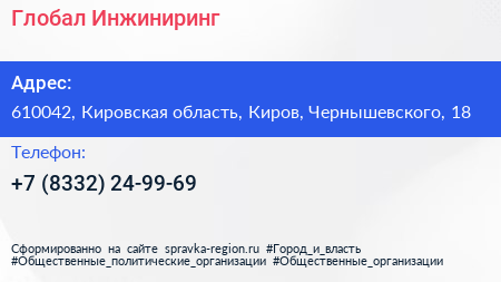 Глобал Инжиниринг по адресу 610042, Кировская область, Киров, Чернышевского, 18 в дальнейшем Организация, размещена в следующих категориях: