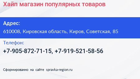 Хайп, магазин популярных товаров по адресу 610008, Кировская область, Киров, Советская, 85 в дальнейшем Организация, размещена в следующих категориях:
