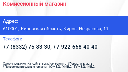 Комиссионный магазин по адресу 610001, Кировская область, Киров, Некрасова, 11 в дальнейшем Организация, размещена в следующих категориях: