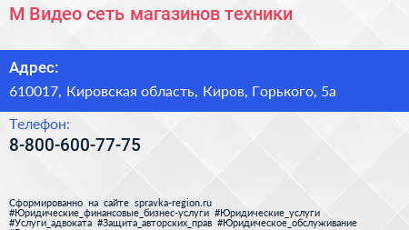 М.Видео, сеть магазинов техники по адресу 610017, Кировская область, Киров, Горького, 5а в дальнейшем Организация, размещена в следующих категориях: