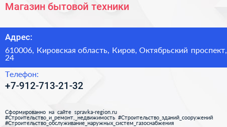 Магазин бытовой техники по адресу 610006, Кировская область, Киров, Октябрьский проспект, 24 в дальнейшем Организация, размещена в следующих категориях: