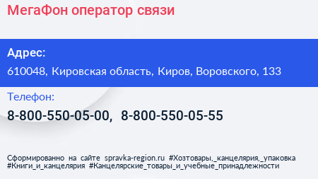 МегаФон, оператор связи по адресу 610048, Кировская область, Киров, Воровского, 133 в дальнейшем Организация, размещена в следующих категориях: