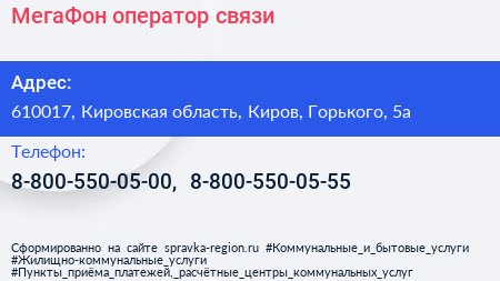 МегаФон, оператор связи по адресу 610017, Кировская область, Киров, Горького, 5а в дальнейшем Организация, размещена в следующих категориях: