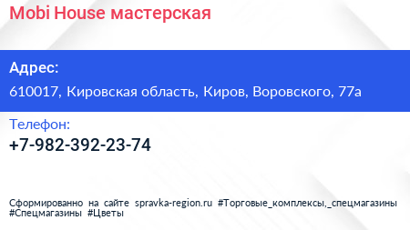 Mobi House, мастерская по адресу 610017, Кировская область, Киров, Воровского, 77а в дальнейшем Организация, размещена в следующих категориях: