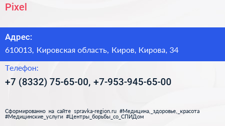 Pixel по адресу 610013, Кировская область, Киров, Кирова, 34 в дальнейшем Организация, размещена в следующих категориях: