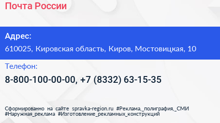 Почта России по адресу 610025, Кировская область, Киров, Мостовицкая, 10 в дальнейшем Организация, размещена в следующих категориях: