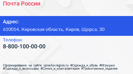 Почта России по адресу 610014, Кировская область, Киров, Щорса, 30 в дальнейшем Организация, размещена в следующих категориях: