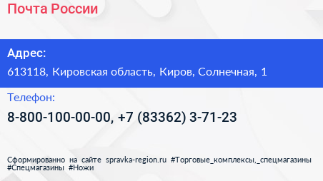 Почта России по адресу 613118, Кировская область, Киров, Солнечная, 1 в дальнейшем Организация, размещена в следующих категориях: