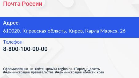 Почта России по адресу 610020, Кировская область, Киров, Карла Маркса, 26 в дальнейшем Организация, размещена в следующих категориях: