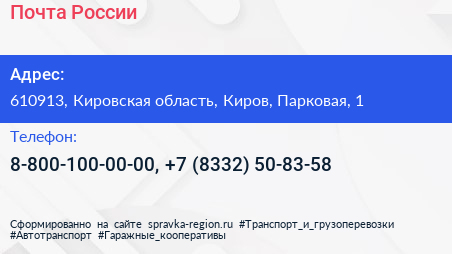 Почта России по адресу 610913, Кировская область, Киров, Парковая, 1 в дальнейшем Организация, размещена в следующих категориях: