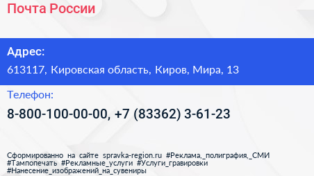 Почта России по адресу 613117, Кировская область, Киров, Мира, 13 в дальнейшем Организация, размещена в следующих категориях: