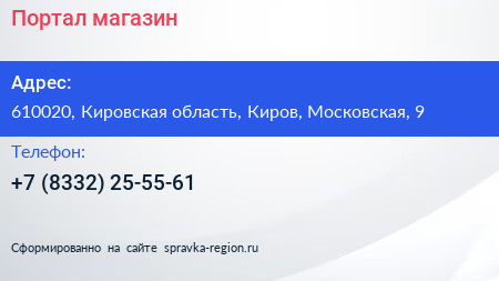 Портал, магазин по адресу 610020, Кировская область, Киров, Московская, 9 в дальнейшем Организация, размещена в следующих категориях: