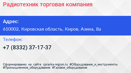 Радиотехник, торговая компания по адресу 610002, Кировская область, Киров, Азина, 8а в дальнейшем Организация, размещена в следующих категориях: