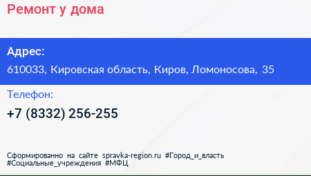 Для связи с организацией воспользуйтесь номером телефона: +7 (8332) 256-255. Пн: c 10:00-19:00, Вт: c 10:00-19:00, Ср: c 10:00-19:00, Чт: c 10:00-19:00, Пт: c 10:00-19:00, Сб: c 10:00-16:00, Вс: выходной, вы можете обратиться в эту организацию.