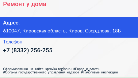 Для связи с организацией воспользуйтесь номером телефона: +7 (8332) 256-255. Пн: c 10:00-19:00, Вт: c 10:00-19:00, Ср: c 10:00-19:00, Чт: c 10:00-19:00, Пт: c 10:00-19:00, Сб: c 10:00-16:00, Вс: выходной, вы можете обратиться в эту организацию.