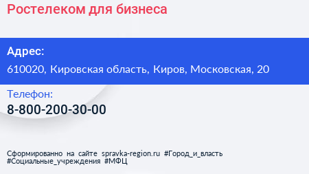 Ростелеком для бизнеса по адресу 610020, Кировская область, Киров, Московская, 20 в дальнейшем Организация, размещена в следующих категориях: