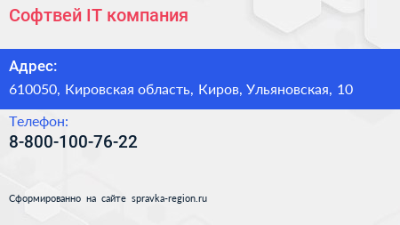 Софтвей, IT-компания по адресу 610050, Кировская область, Киров, Ульяновская, 10 в дальнейшем Организация, размещена в следующих категориях: