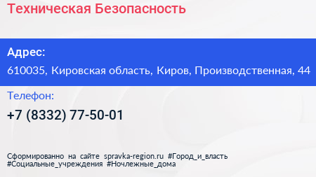 Техническая Безопасность по адресу 610035, Кировская область, Киров, Производственная, 44 в дальнейшем Организация, размещена в следующих категориях: