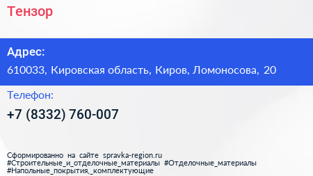 Тензор по адресу 610033, Кировская область, Киров, Ломоносова, 20 в дальнейшем Организация, размещена в следующих категориях: