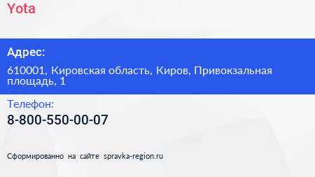 Yota по адресу 610001, Кировская область, Киров, Привокзальная площадь, 1 в дальнейшем Организация, размещена в следующих категориях: