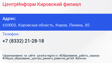 ЦентрИнформ, Кировский филиал по адресу 610002, Кировская область, Киров, Ленина, 85 в дальнейшем Организация, размещена в следующих категориях: