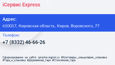 iСервис Express по адресу 610017, Кировская область, Киров, Воровского, 77 в дальнейшем Организация, размещена в следующих категориях: